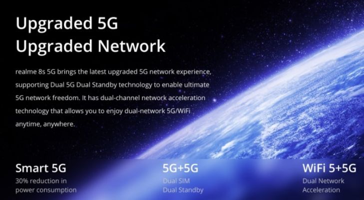 realme 8s 5G brings the latest upgraded 5G network experience, supporting Dual 5G Dual Standby technology to enable ultimate 5G network freedom. It has dual-channel network acceleration technology that allows you to enjoy dual-network 5G/WiFi anytime, anywhere.