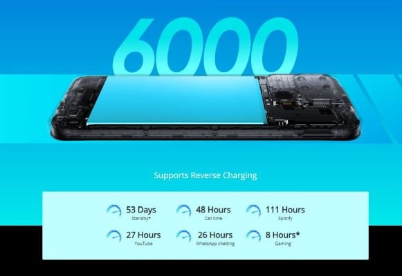 realme narzo 50A in your pocket means no more low-battery anxiety. Its 6000mAh battery is powerful enough to support continuous YouTube viewing for 27 hours, or Spotify listening for 111 hours.