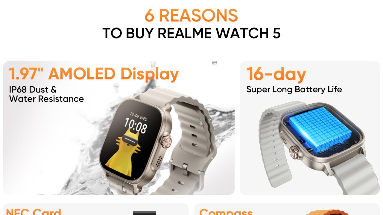 - Experience the new realme Watch 5 with a vibrant 5 cm (1.97 inch) AMOLED display
