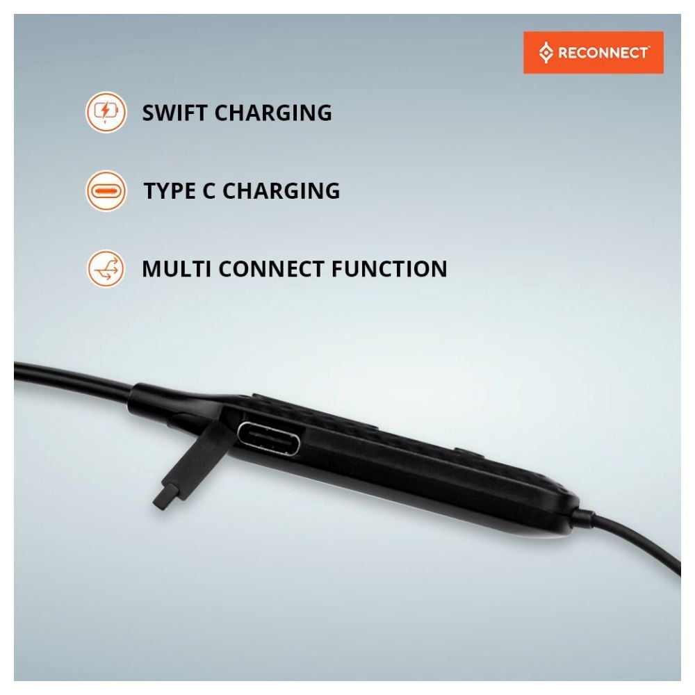 The Reconnect Dank Neckband do swift charging quickly with its Type C port. Charge, connect via BT, and listen to your favourite songs for up to 16 hours non-stop!