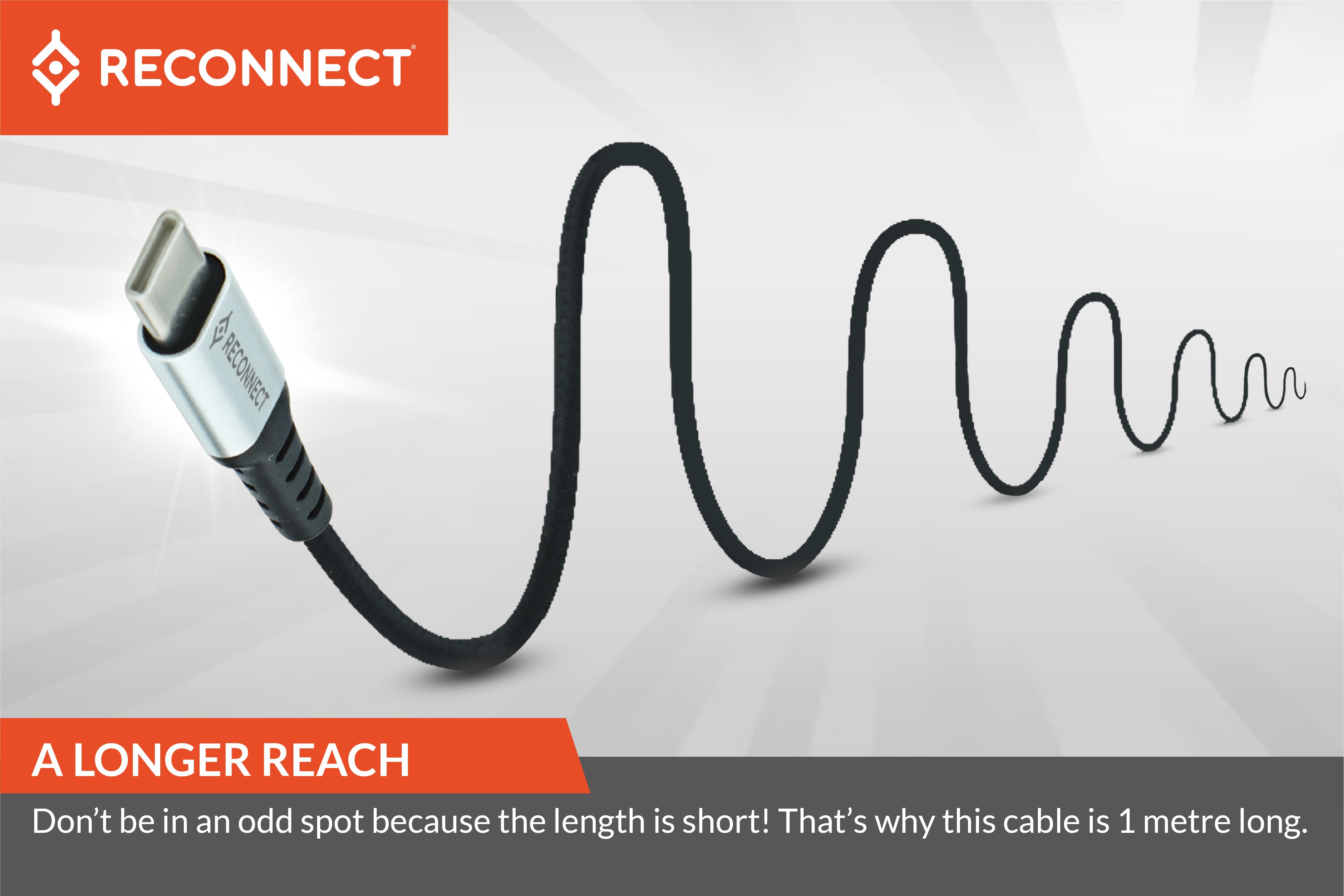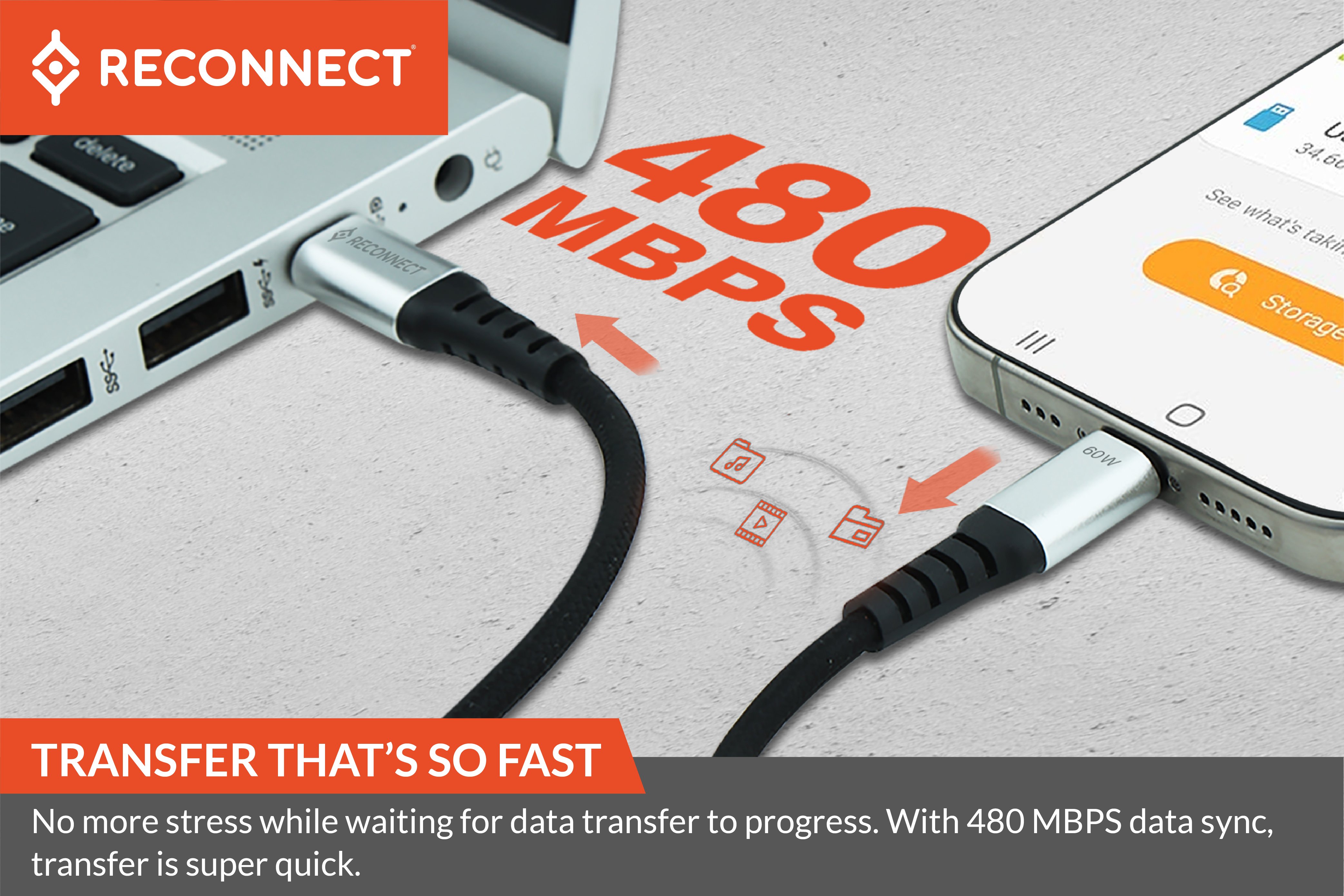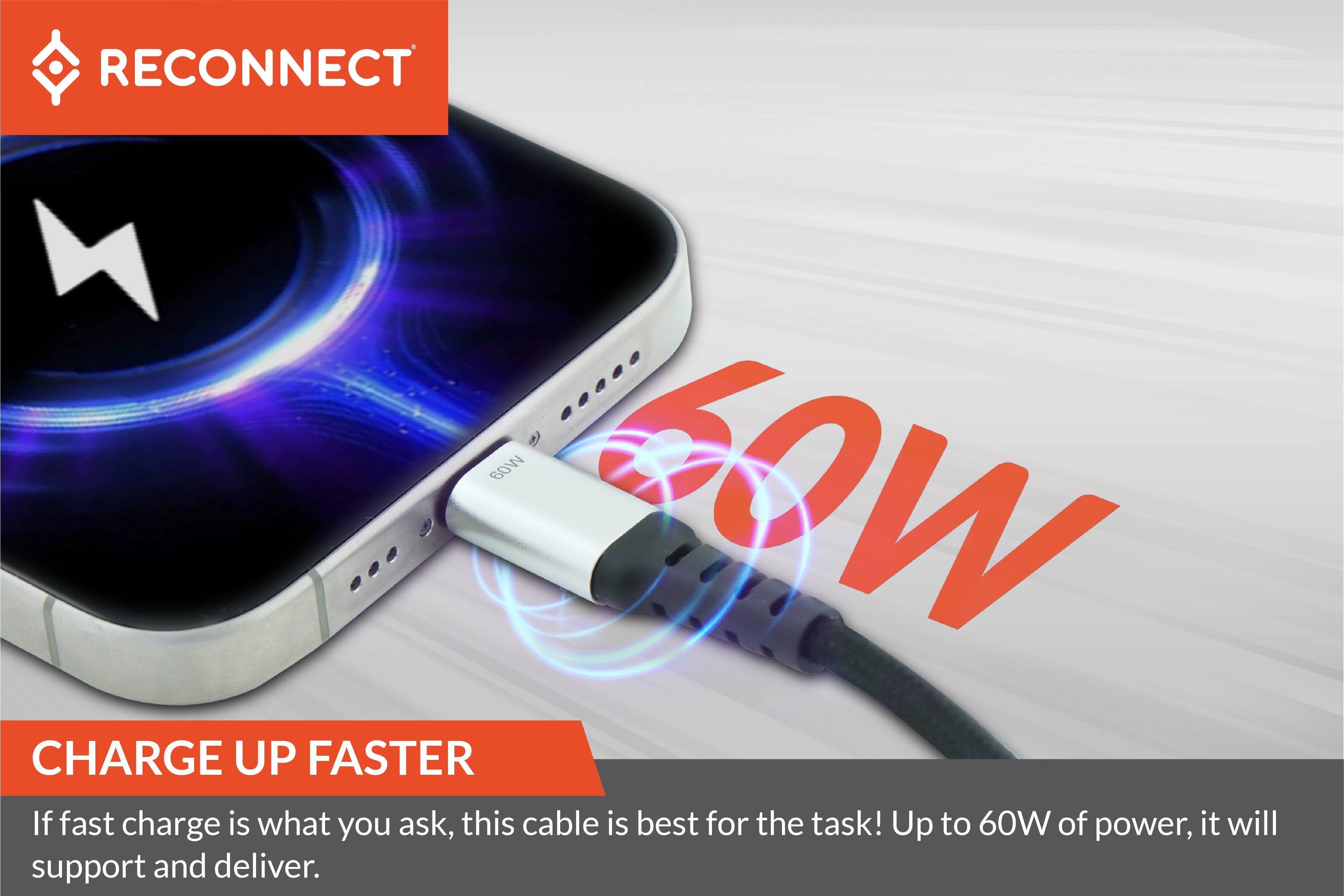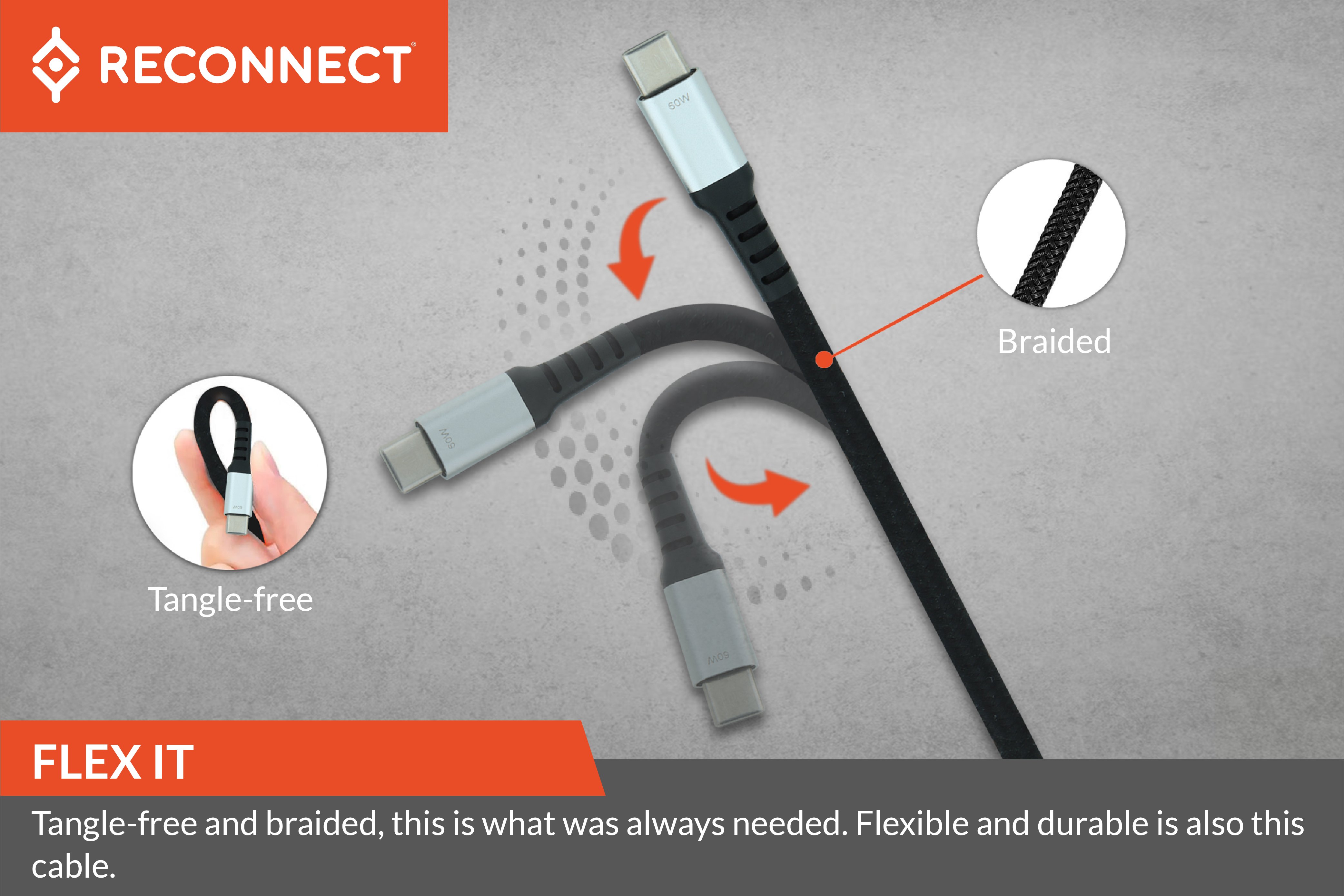 Reconnect Type-C to C, 60 W Braided Cable, Upto 480 Mbps Data Sync, Fast Charging, 100 cm (1 m) Length, Tangle Free, Black, RCTCB1060