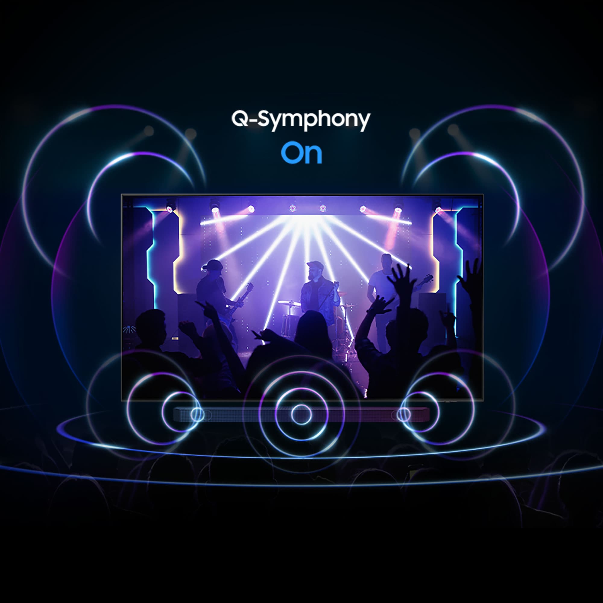 Q-SymphonyTV and soundbar orchestrated in perfect harmony. Q-Symphony uniquely allows TV and soundbar speakers to operate simultaneously without muting TV speakers for a more harmonious sound. Check for Q-Symphony compatibility on soundbar product specifications. * Soundbar sold separately.