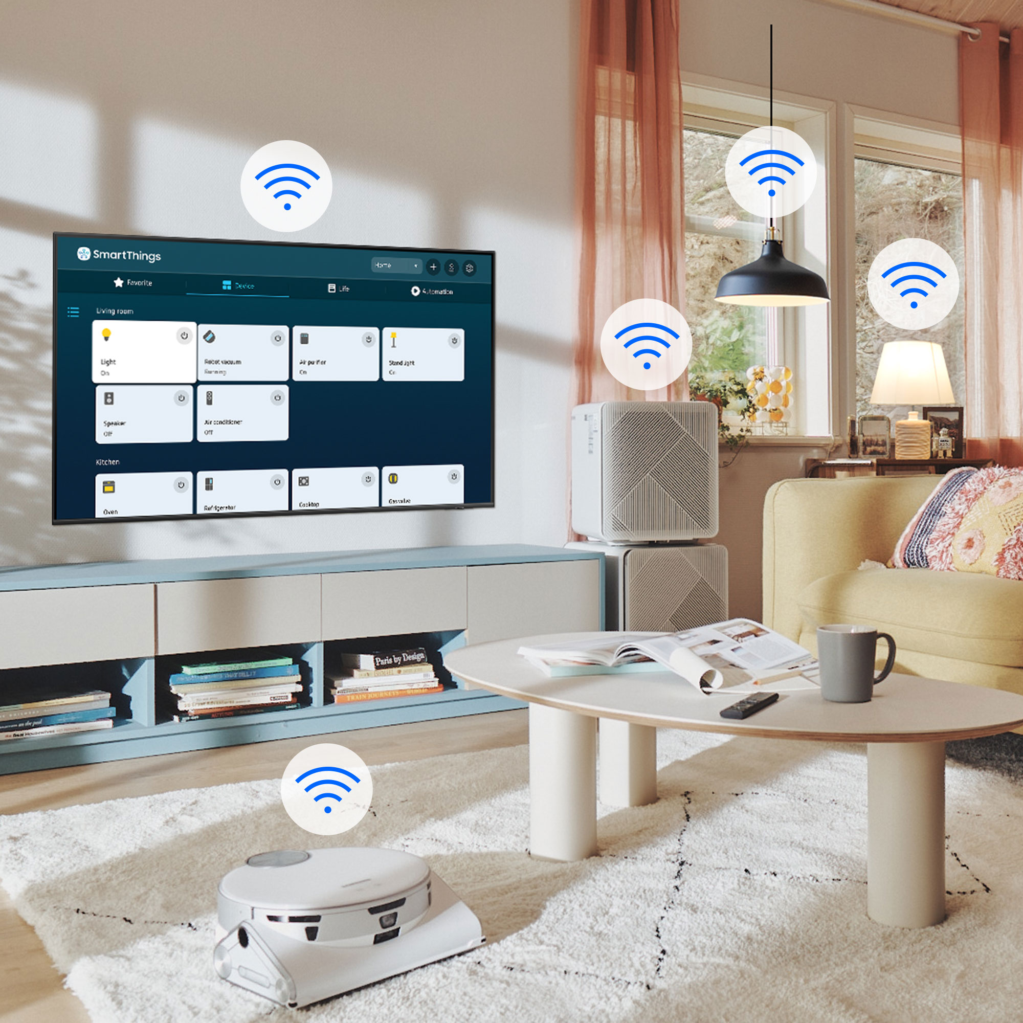 SmartThings (IoT Hub)Your best home butler. Relax and let SmartThings seamlessly connect to, monitor and control all your smart devices to intuitively control your home via a built-in hub. * Available technology, functions and features may vary by country, service provider, network environment or product, and are subject to change without notice. * Requires a Wi-Fi, Bluetooth or other wireless network connection and login to Samsung account.