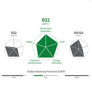 Protect the planet by reducing the impact of climate change. The air conditioner uses the next generation R32 refrigerant, which helps conserve the ozone layer and has a low impact on global warming compared to conventional R22 or R410A refrigerants.