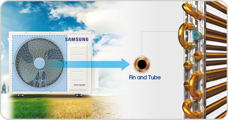 Samsung copper condenser is made of copper tube and anti corrosion coated fin to protect the condenser from rusting, which helps to maintain the optimal performance of the heat exchanger.