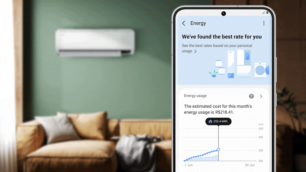 Control energy usage to reduce your bills. SmartThings Energy lets you easily check your power consumption. If the estimated amount exceeds your target, it adjusts the energy usage of all smart appliances. When the air conditioner is on it draws the blinds and alerts you if you go out.