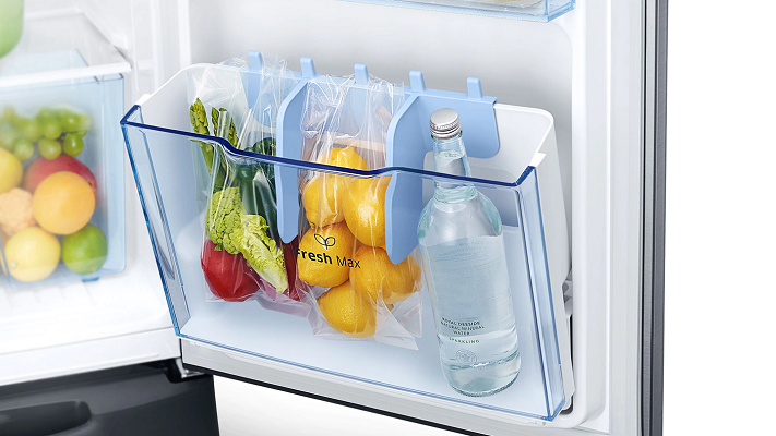 A multi-utility door bin, FreshMax, provides plenty of extra space to store fruits and vegetables. It has a special divider to attach plastic bags and separate bottles, an Autoclose function and built-in deodorizer.
