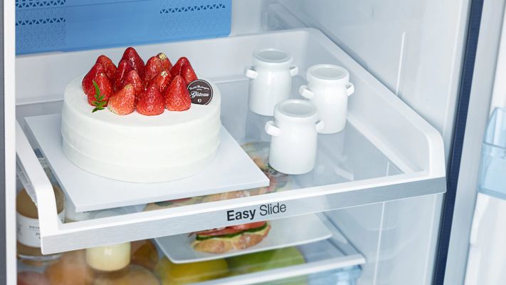 Getting food out of a refrigerator often means navigating around items. The Easy Slide Shelf lets you efficiently store, organise and access your groceries – easily reaching things right at the back and corners.