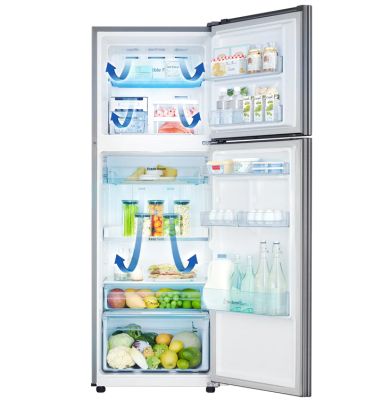 - DescriptionYou’re looking at the Samsung RT28R3723S8 double door refrigerator. Measuring 63.7 cm in depth 55.5 cm in width and 154.5 cm in height, this 253-litre double door refrigerator is suitable for a family of 2 to 3 members, and can be placed in the kitchen or dining area. The upper part of the refrigerator comprises of a single door freezer compartment, while the lower part consists of a single door fridge compartment. The freezer compartment offers space to store items like; ice-cream tubs, frozen yoghurt, frozen food and, the freezer bins let you store items like; dry fruits, chocolates etc. The freezer also has a moveable ice maker that not only forms ice cubes in a short time but also can be moved to increase space. The fridge compartment has sturdy shelves that can withstand the weight of heavy pots and containers with ease. It also has an easy-to-slide shelf that lets you store, organise and access the items easily. The tall bottle guard rack on the side door, lets you stack tall bottles of water and juice. The Big Veg box in this compartment offers ample space to store fruits and vegetables. The Moist Fresh zone tightly seals moisture when humidity is low, while the vent eliminates excess moisture when humidity is high, thereby retaining the freshness of vegetables and fruits. This refrigerator comes with an all-round cooling system that ensures even cooling in the refrigerator. The deodorizer eliminates odour and keeps the refrigerator odour-free. In case of power cut, the cool pack in the freezer and a cool wall in the fridge keeps food items chilled for up to 12 hours. This Samsung refrigerator has a sleek feature panel on the exterior that lets you maximise the cooling of the fridge compartment or freezing of the freezer compartment depending on your requirement.