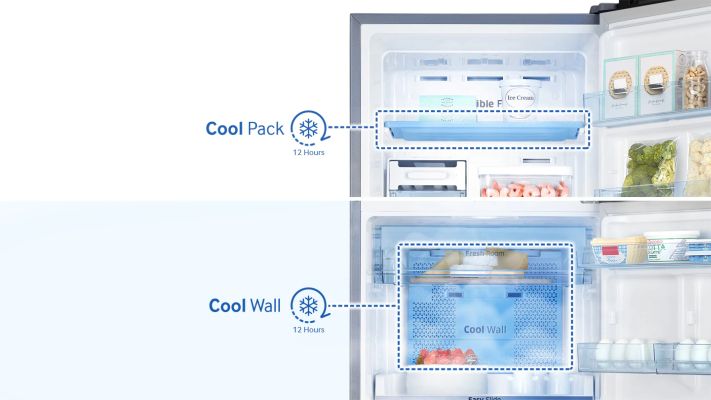 The perfect blackout solution, as it keeps food fresher if the power is cut. A Cool Pack in the freezer and Cool Wall in the fridge keep food items chilled for up to 12 hours during powercut, so it doesn't spoil. Fast cooling and Freezing