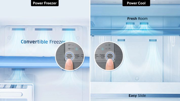 Delivers a rapid cooling performance to preserve food’s freshness, chill drinks and make more ice. At the touch of a button, Power Cool chills food in the fridge 31% faster and Power Freeze makes ice 31% faster.