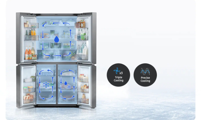 Keep food fresher for longer and preserve its natural flavor and taste. Triple Cooling independently controls the temperature and humidity in 3 compartments and prevents odors from mixing. Precise Cooling also minimizes any temperature fluctuation to preserve the quality and texture of food.