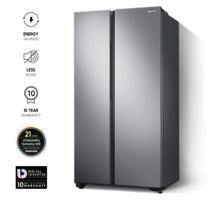 - DescriptionAdd to the exquisiteness of your home décor with the stylish and utilitarian Samsung 676 litres Side-by-Side Refrigerator which makes storage a completely safe option for you. The refrigerator helps you cut costs on many fronts to give you freshly stored products so that you can enjoy a perfectly chilled dessert after a long day at work. The digital inverter controls the cooling speed according to the needs of the contents inside and helps to consume minimum electricity so that you don’t have to end up paying huge bills at the end of each month. All these amazing cooling features backed by a stunning design makes it the perfect cooling option for you.