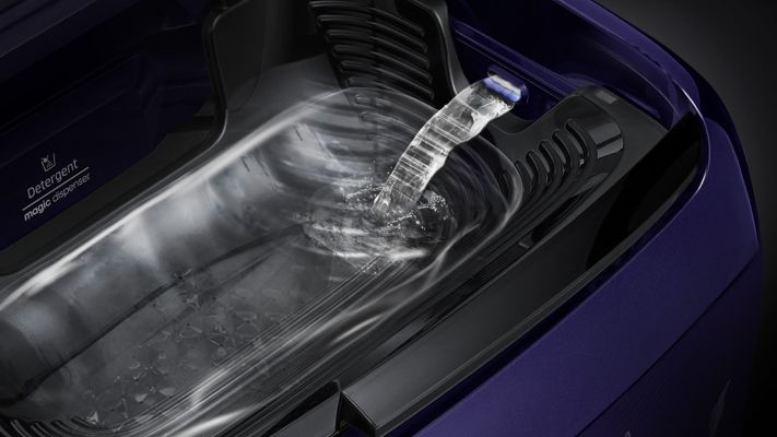 A Magic Dispenser lets you wash with less worrying about residual detergent. It creates a powerful water vortex that dissolves detergent and disperses it evenly before the wash cycle starts.