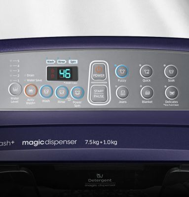 - DescriptionYou are looking at the Samsung WA70M4400HV/TL Top Loading Fully Automatic Washing Machine. Measuring, 54 cm in width, 56.8 cm in depth and 100.2 cm in height this stylish top load washing machine can be placed easily in the dry area of your home or can be placed at the side wall near the bathroom or in any other preferred corner of your home. The Diamond Drum’s soft curl design effectively removes grime efficiently while being gentle on the fabric. The built-in sink in this washing machine is perfect to handwash delicate fabrics and pre-treat stained clothes. The magic filter collects lint from the clothes during the wash cycle to prevent drainage clog. This washing machine’s Eco Clean Tub cycle is designed to remove any detergent build up and maintain an odour-free washer. Packed with an ergonomically designed control panel for selection of wash programs and a stylish ice blue LED display for easy monitoring of the wash cycle, this 7kg Samsung washing machine is a convenient choice for your laundry needs.