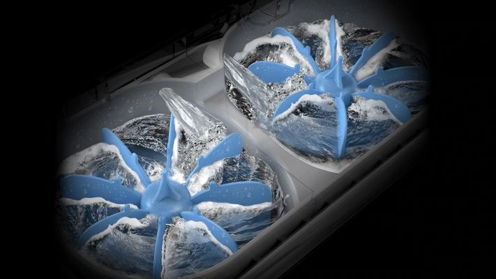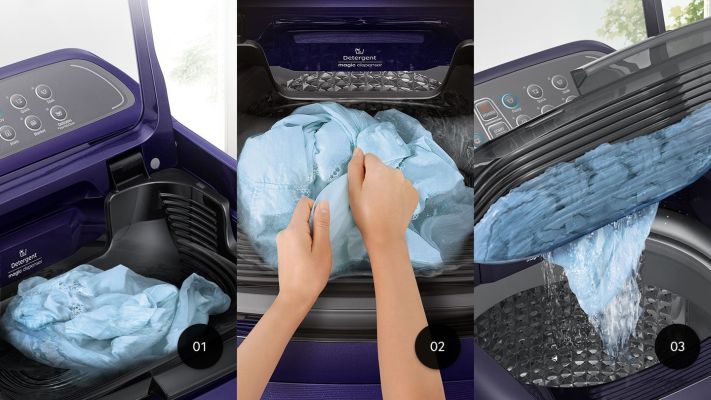 A Magic Dispenser lets you wash with less worrying about residual detergent. It creates a powerful water vortex that dissolves detergent and disperses it evenly before the wash cycle starts.