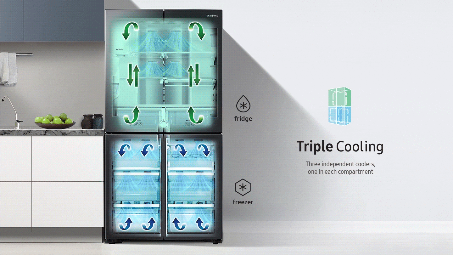 A TRIPLE COOLING SYSTEM INDEPENDENTLY CONTROLS AND OPTIMIZES THE TEMPERATURE, MAXIMIZES HUMIDITY AND PREVENTS ODORS MIXING IN 3 COMPARTMENTS.A METAL COOLING PLATE ALSO HELPS KEEP THE AIR COOL TO MAINTAIN FRESHNESS.