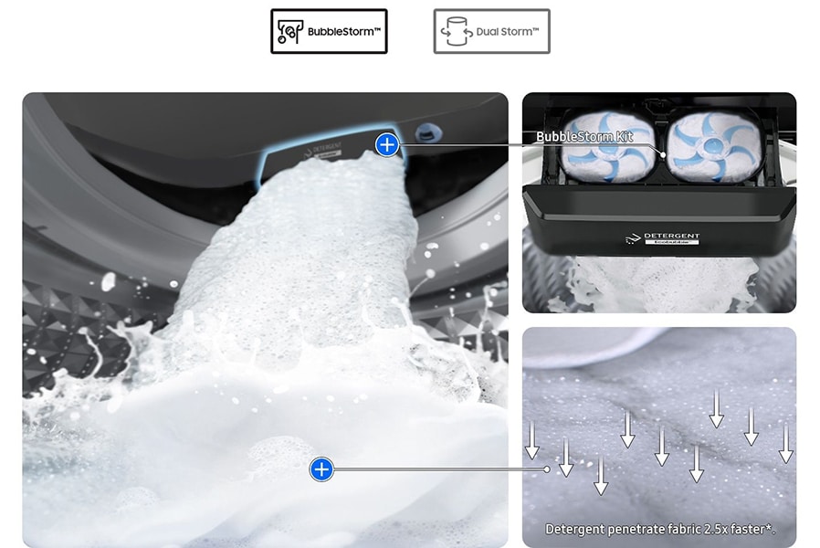 Wash powerfully and more efficiently. Ecobubble with Digital Inverter Technology gets clothes really clean using 73% less energy and 19% less water. BubbleStorm helps detergent penetrate fabric 2.5x faster and gives 20% better fabric care. Dual Storm pulsator creates a vortex of water current that cleans more effectively.