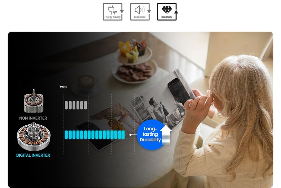 Enjoy long-lasting, powerful performance with less noise and greater energy efficiency - 5 star energy rating. The Digital Inverter Motor uses strong magnets to provide outstanding durability and power.