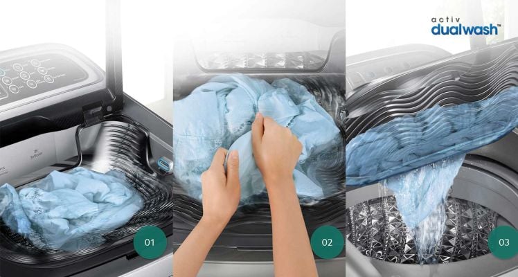 The activ dualwash system includes a sink for a convenient place to hand-wash delicate items and pre-treat heavily soiled clothes. A water jet starts and stops at the push of a button.