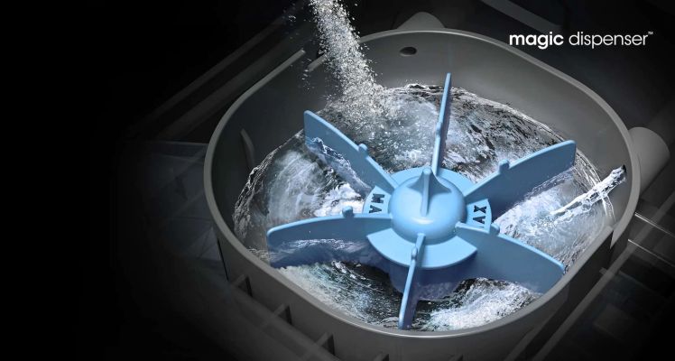 Magic dispenser lets you wash with less worry about residual detergent. It creates a powerful water vortex that dissolves detergent and disperses it evenly before the wash cycle starts.