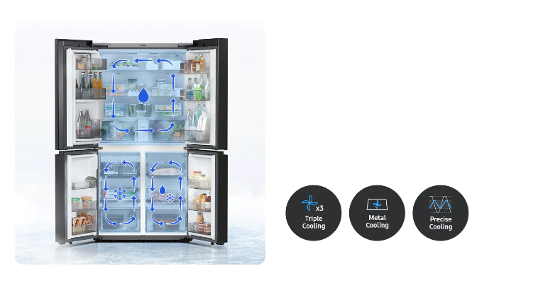 Keep food fresher for longer and preserve its natural flavor and taste. Triple Cooling independently controls the temperature and humidity in 3 compartments and prevents odors from mixing. Precise Cooling also minimizes any temperature fluctuation to preserve the quality and texture of food. Metal Cooling plate helps keep the fridge cool