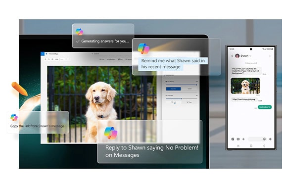 Stay on top of your tasks via quick chat prompts with Copilot's personalized AI assistance. Plus, get smarter communication tools - access contacts and send messages effortlessly from your PC or Samsung Galaxy mobile device with a simple chat command.