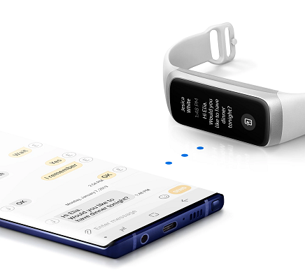 No ordinary fitness tracker. Galaxy Fit keeps you informed by allowing you to reply instantly with preset messages for incoming texts. It syncs Do Not Disturb settings with your phone to keep you from interruptions, and even suggests roaming clock display when entering a new time zone.