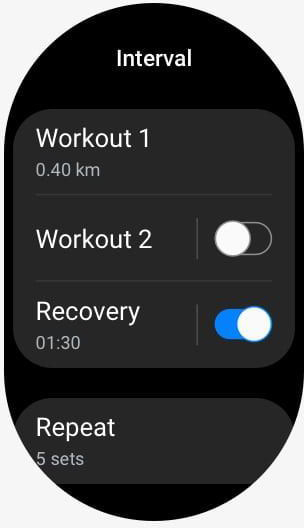 Interval TrainingPre-set the duration, distance and number of sets for running and cycling interval workouts on your Galaxy Watch4. Then, follow the guide through high- and low-intensity training sessions on your wrist.