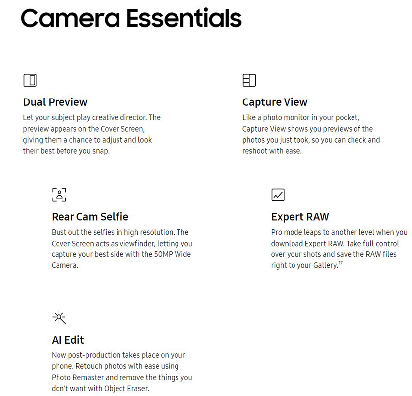 With the upgraded Rear Camera, Space Zoom and Nightography, we're bringing a pro-level kit to the foldable form for the first time. Use the massive Main Screen as a viewfinder to flex your photo skills with new tech.