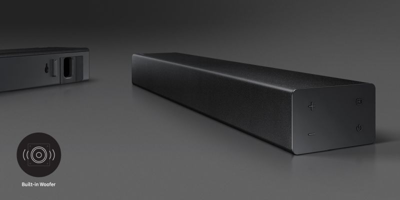 Surround yourself with the deep bass you want without a separate woofer. The Soundbar comes equipped with two built-in woofers and a sound duct. That means more space, and more bass for you.