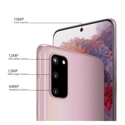 - DescriptionThe Samsung S20 is designed to look premium and offers a smartphone experience like never before. It is the phone that will change photography with the revolutionary 8K resolution and the massive leap forward in zoom for mobile photography. You can also add in Samsung Knox security, an intelligent battery, powerful processor, and massive storage - and the Galaxy S20 unveils a whole new world for mobile. Its sensor size also has almost been tripled so you can shoot more of the night shots. The larger sensor and anti-rolling stabilizer balances camera movement so your footage won't turn out blurry and unstable, but super smooth. Stay on top of your games, streams, and social media with download speeds up to 2.0Gbps on LTE and secure Wi-Fi6 connections. Our batteries are powerful, but they're also intelligent, adjusting to your mobile habits to save power and last way longer on a single charge. Bezels are pushed way back and there's no notch - just a miniscule camera hole. The HDR10+ certified Infinity-O Display offers a big, immersive screen with limited onscreen interruptions. 120Hz makes your scrolling smooth with seamless screen transitions. While super fast, precise touch response delivers a more reactive gaming experience. You'll believe it when you see it - and feel it. Its eye care display helps prevent eyestrain and sleep disturbances by reducing blue light at the pixel level without sacrificing color. Built into the screen, its ultrasonic fingerprint feature pulses to detect the 3D ridges and valleys of your prints for invisible security. Our advanced zoom starts with 3x Hybrid Optic Zoom. Couple that with Super Resolution Zoom bolstered by AI and now you can get up close to the action like never before. The larger image sensor gives you crisp and bright low light photos, and it's even brighter in Night mode. The camera can capture multiple shots at once, merging them into one photo with less blur and noise. The 10 MP Front Camera with fast AF captures your best angles for clear selfies that stand out. It primary camera offers a whopping 12 MP Ultra Wide camera + 12 MP wide-angle camers + 64 MP telephoto camera.