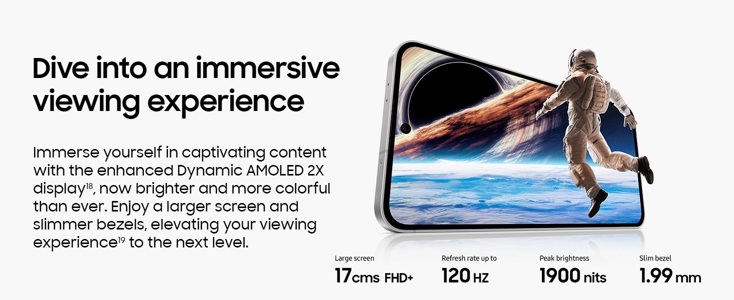 - Display: 16.94 cm (6.67 inch), 120Hz Dynamic AMOLED 2X, FHD+, 1900+ nits