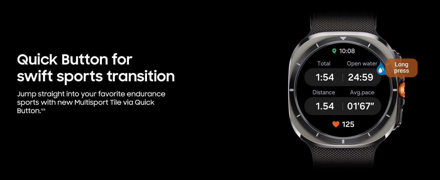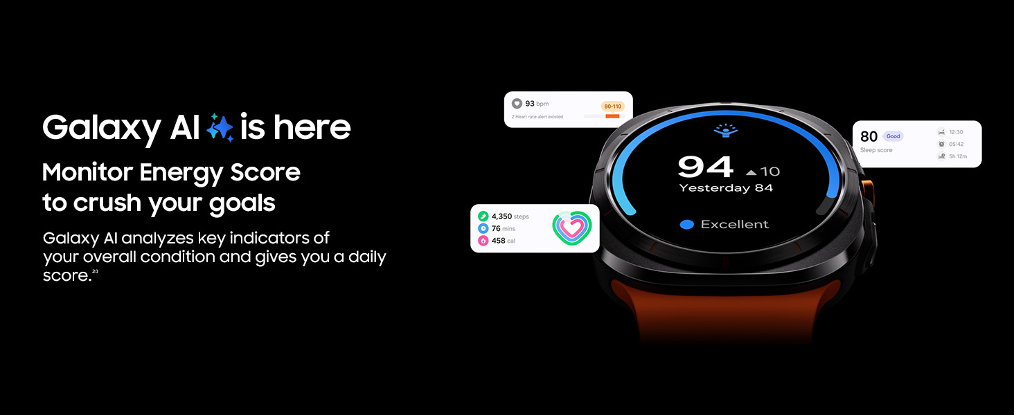 - ADVANCED INTELLIGENCE: Featuring Galaxy AI-powered health and fitness monitoring, the Watch ULTRA includes Energy Score, Booster Card, and personalized HR and FTP to enhance the user's maximum capabilities based on daily conditions. When paired with a Galaxy AI Smartphone, it offers quick reply suggestions tailored to the context of recent messages.
