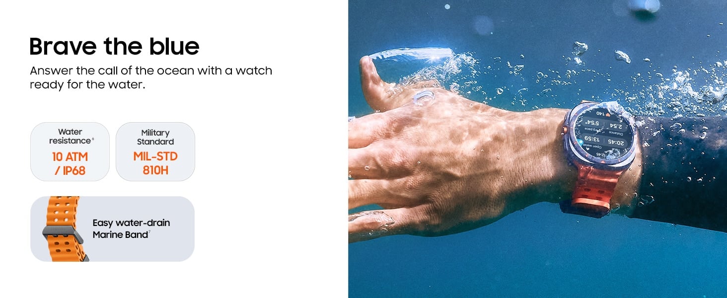 - EXTREME DURABILITY: Built with a Cushion Design Dial made of Aero-grade Titanium and Sapphire glass, the Watch ULTRA is designed to endure the toughest conditions. With a 10ATM and IP68 rating, it is prepared for oceanic adventures. The MIL-STD-810H certification further enhances its reliability in rugged outdoor environments, and it can operate effectively across a wide range of temperatures and altitudes.