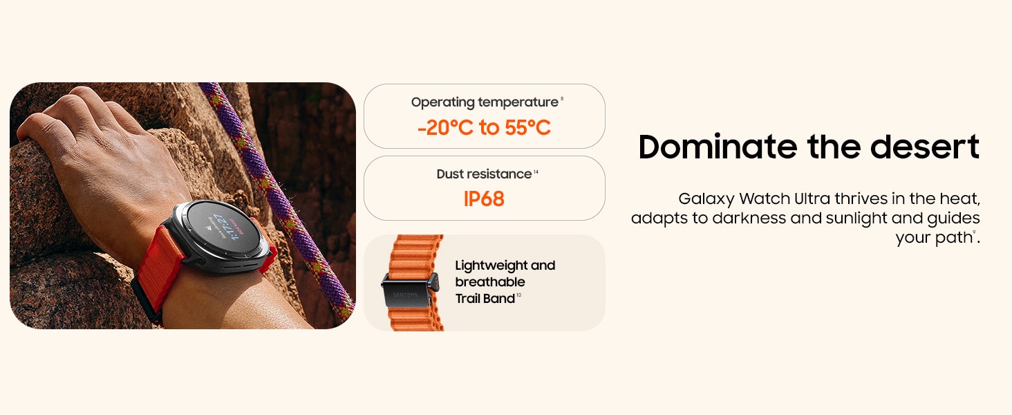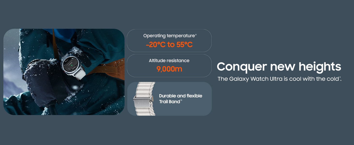- EXTREME DURABILITY: Built with a Cushion Design Dial made of Aero-grade Titanium and Sapphire glass, the Watch ULTRA is designed to endure the toughest conditions. With a 10ATM and IP68 rating, it is prepared for oceanic adventures. The MIL-STD-810H certification further enhances its reliability in rugged outdoor environments, and it can operate effectively across a wide range of temperatures and altitudes.
