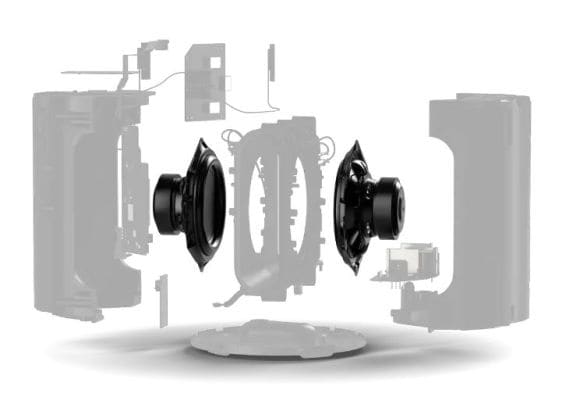 Both woofers face inwards to create a force-cancelling effect that neutralises distortion.