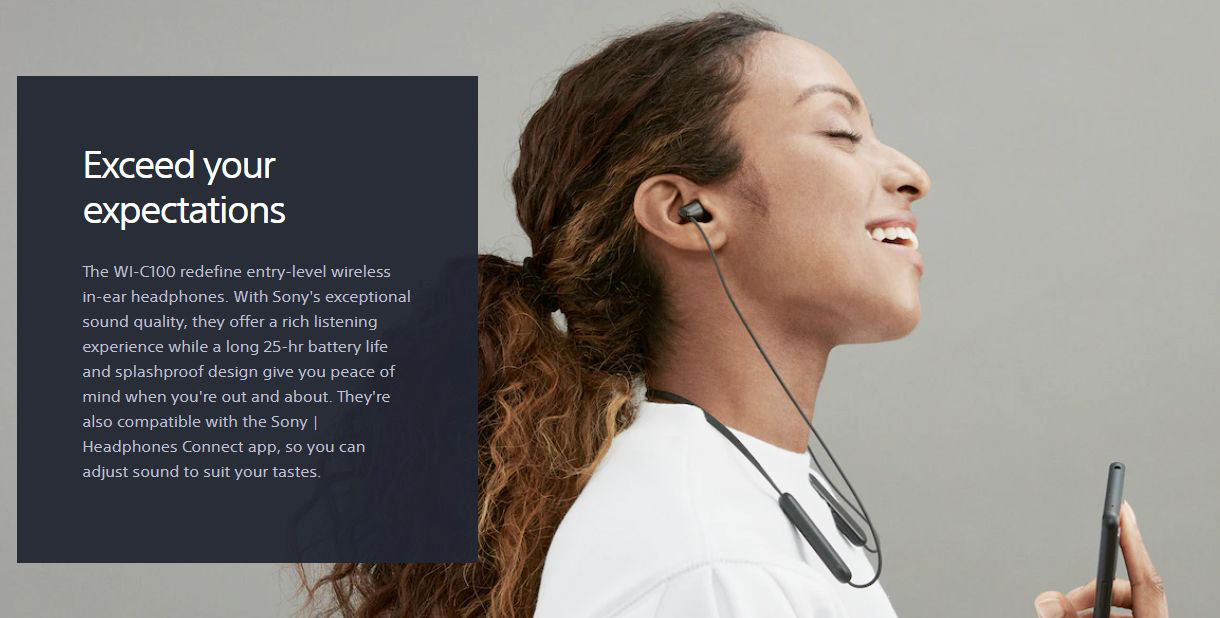 The WI-C100 headphones are easy to operate, with buttons to play and pause, skip tracks and adjust the volume, as well as receive calls. For convenience, the buttons have even been redesigned with a more pronounced shape making them easier to press.