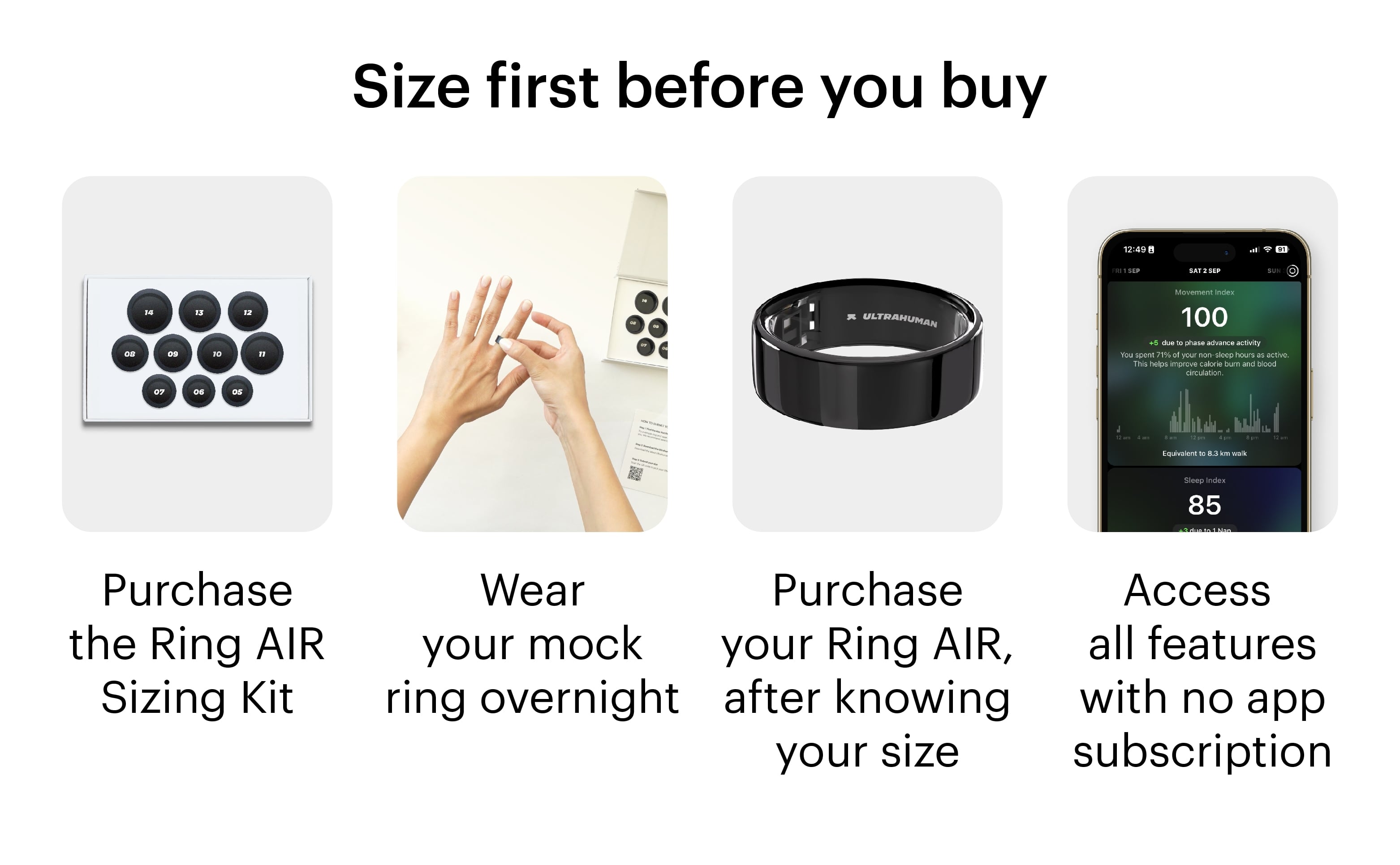 - SIZE FIRST - Ultrahuman Ring sizes are different from standard ring sizes. Purchase Ultrahuman Sizing Kit first to get the perfect Ring AIR size. Ring AIR is available in 10 sizes from 5-14