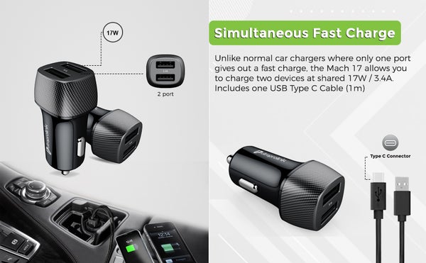 The Mach 17 is a compact yet sturdy USB Car charger. It can simultaneously power two devices - including two Smartphones - thanks to the combined 3.4A output. A fast charge Type C cable (100cm) is provided in the box. No matter the car battery voltage, the Mach 17 will automatically adjust to protect your device and charge at a steady rate. Mach 17 comes with a number of built-in protection methods to keep your device safe. The built-in over & under voltage, over-current, and over-temperature protections ensure your mobile phone and other device's safety needs are guaranteed. The Smart IC automatically detects and delivers the optimal charge - making it the most effective way to power any connected device. No matter what device you have, the smart IC always detects and sends the optimal current for safe charging thereby protecting both the charger & the connected device.