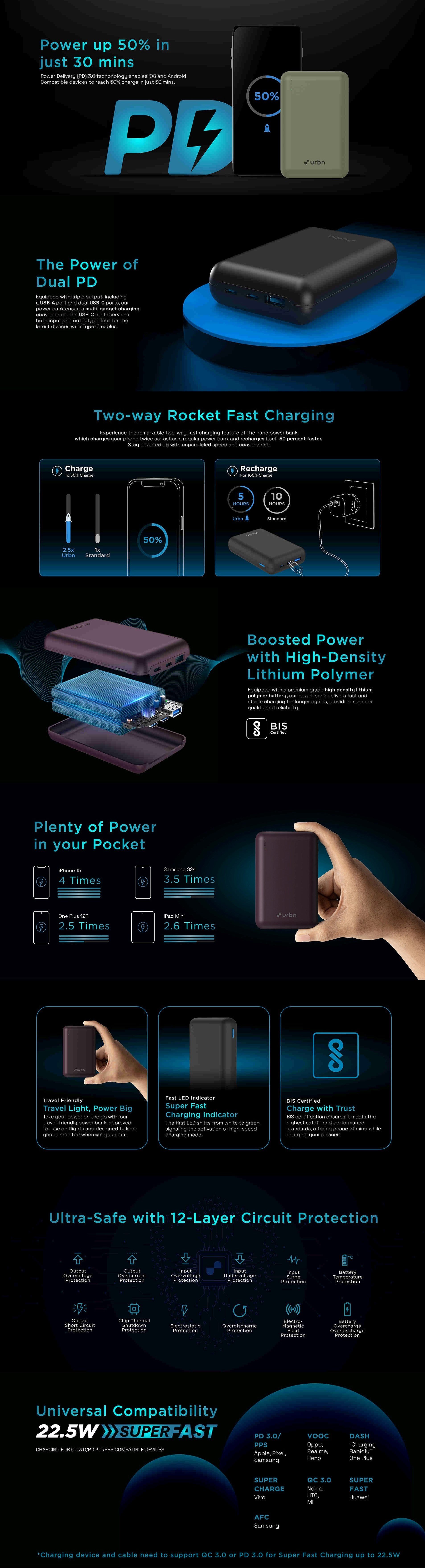 Urbn 20000 mAh 22.5 W Nano Power Bank, Black