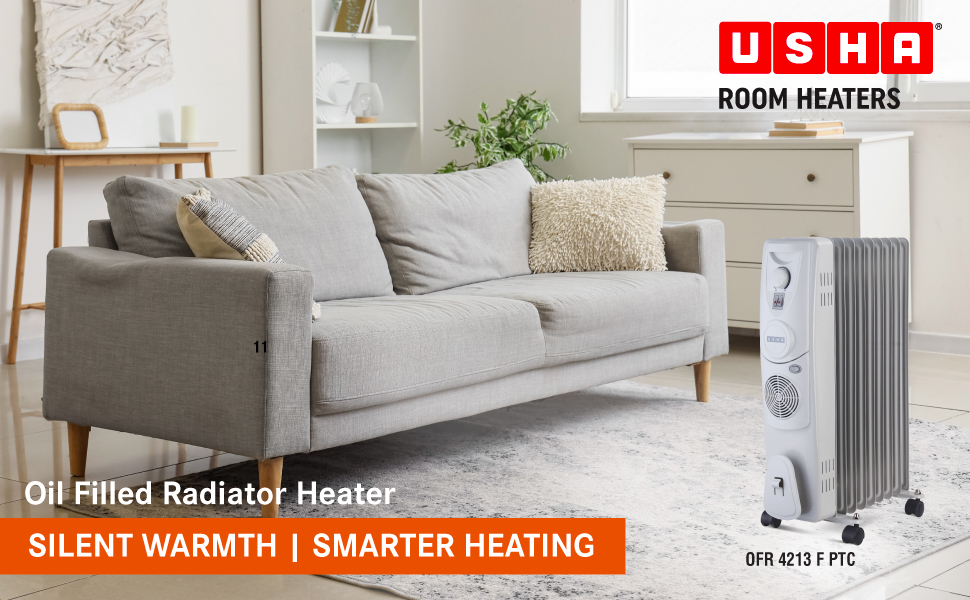Usha 4213 F PTC Oil Filled Radiator 2500 W, 13 Fins, 3 Heat Settings, Adjustable Thermostat, Built-in Fan, Overheat and Tip-Over Protection, Caster Wheels, Black