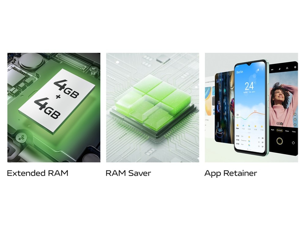 Memory BoosterExtended RAM allocates a portion of unused ROM space to RAM based on RAM usage. This keeps more apps active and enables instant app switching. RAM Saver frees up more space and prevents overcrowding. App Retainer restarts the trust-listed apps in the background at any time, returning them to the last viewed interface.