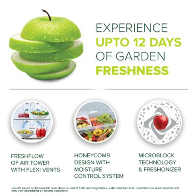 Now get upto 12 days of garden freshness with the Honey comb design with Moisture control system, Microblock technology and FreshFlow AirTower with Flexi Vents