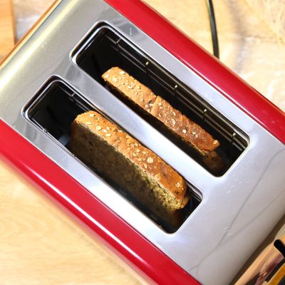The Crimson Edge 2 Slice Toaster features extra-wide, self-centering slots to fit all types of breads.