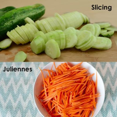 Four settings in slicer-dicer disk for fine and thick juliennes as well as fine and thick slicing. The slicer disks can be used to make thin/thick slices of cucumber, carrots, zucchini and much more. Make thin, beautiful juliennes using the julienne blades.