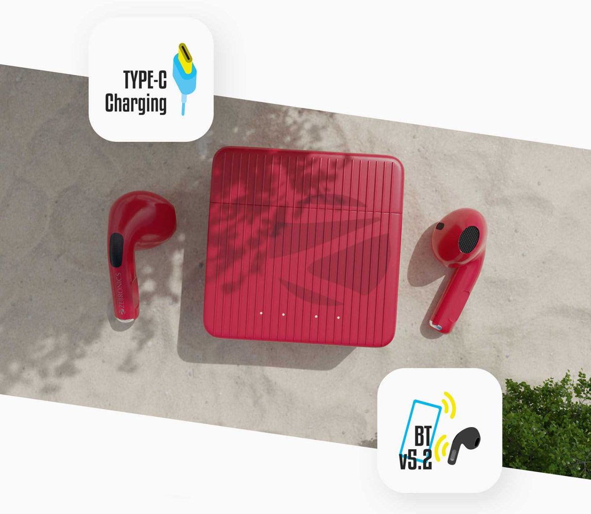 Zebronics Zeb Sound Bomb 3 TWS Wireless Earbuds, upto 12 hrs of playtime, Flash connect, Stem touch control, Splash proof, Voice Assistant, Type-C Charging, Bluetooth 5.2, Red