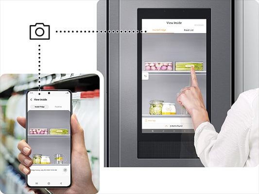 See what food you have in the fridge without opening the door. A View Inside internal camera lets you look inside your refrigerator anytime, anywhere using the SmartThings App or on the Family Hub home screen. So you can quickly check what food you already have, even when you are out shopping.
