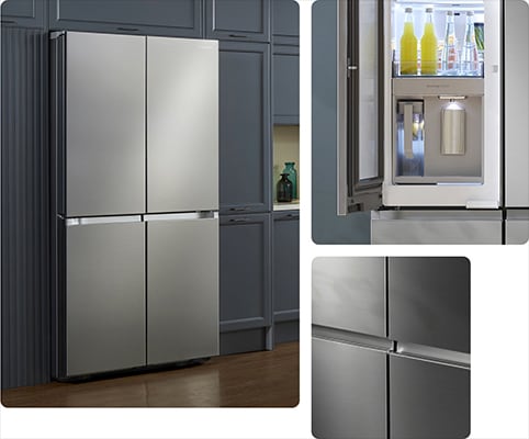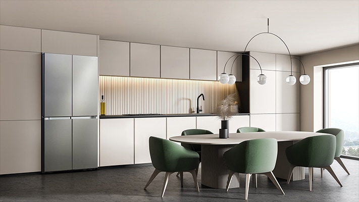 Elevate the look of your kitchen with clean and clutter-free styling. The refrigerator’s cutting-edge design features a timelessly minimalist exterior, with strikingly beautiful flat doors and no external water dispenser. Its simple and sleek look is accentuated by recessed handles.