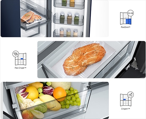 Keep different foods fresh and tasty in the optimal conditions. The Flex Zone is an independently controlled compartment with five pre-set modes: Freeze, Soft Freeze, Meat/Fish, Fruit/Veggies and Beverage. There’s also a Flex Crisper for meat or fish and a Crisper+ for fruit and vegetables.